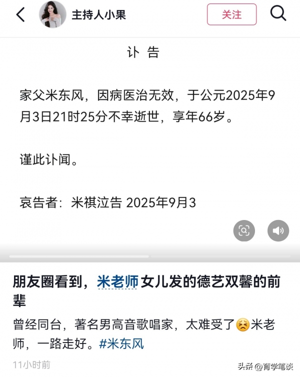主持人小果也转发了一则米东风女儿发布的讣告,称米老师是德艺双馨的艺术家,获悉他去世很难过,愿老师一路走好。
