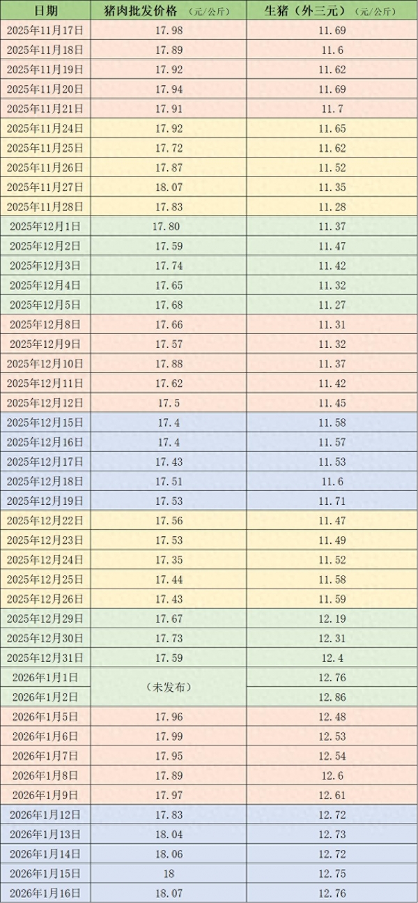 据农业农村部监测,1月16日,全国农产品批发市场猪肉平均价格为18.07元/公斤,与上周五(1月9日)的17.97元/公斤相比,上涨0.6%。本周的平均价格为18元/公斤,与上周17.95元/公斤的均价相比,上涨0.3%。
