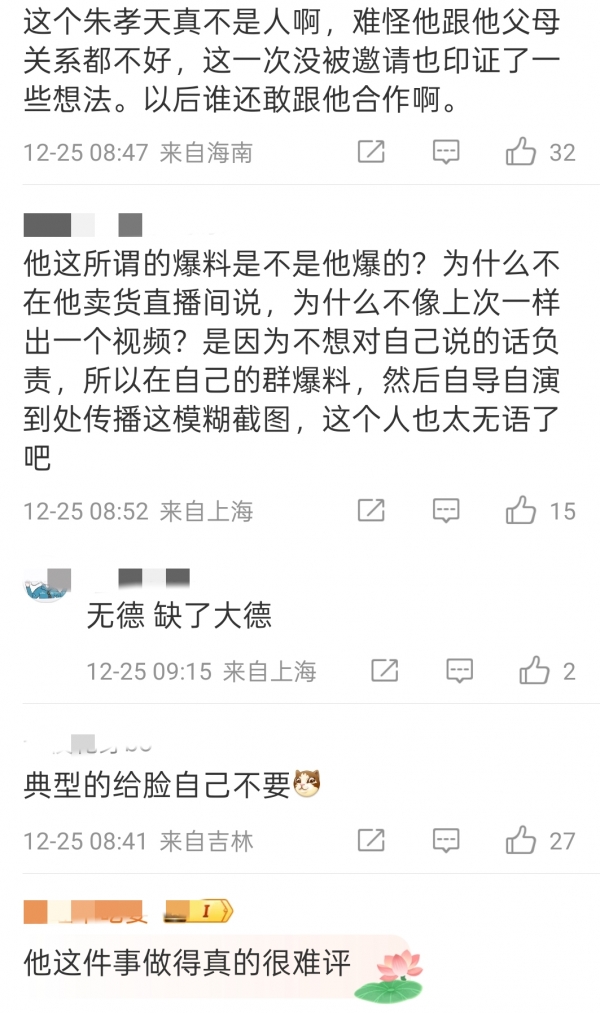 说实话朱孝天现在的行为真的有点"疯"了,这是以一人之力单挑整个相信公司,他的爆料网友们还都不怎么相信,因为他没证据,但又点名道姓的说了阿信,说了相信音乐,对方完全可以告他造谣了。
