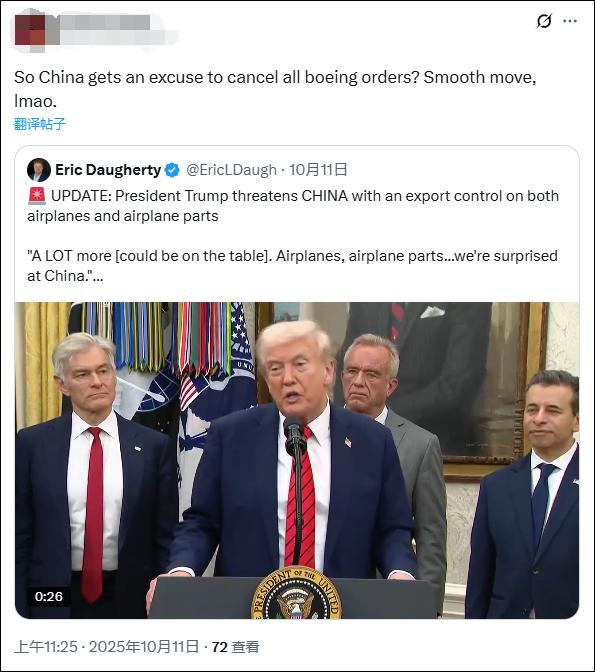 另一位网民则转发了特朗普在白宫宣布考虑禁售波音飞机零部件的讲话视频,并用嘲讽这位美国总统的语气写道:"所以,中国有借口取消所有波音订单了吗?好样的,哈哈。"