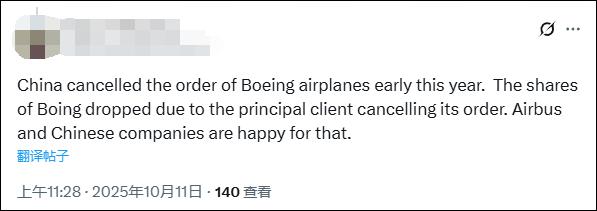 还有一位网民写道:"今年年初,中国取消了波音飞机订单。波音股价因主要客户取消订单而下跌。空客和中国企业对此感到高兴。"