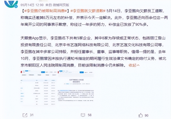 一则 "李亚鹏公司拖欠员工工资长达 10 个月" 的爆料如同一颗重磅炸弹。