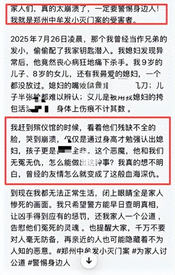 一场以 "兄弟情深" 为名的信任,最终演变成灭门惨案的血色悲剧。河南中牟男子崔某,将多年好友梁先生的妻子与一双儿女残忍杀害,尸体被损毁至难以辨认。案发后,他竟能镇定陪同亲友赶赴现场,可 30 分钟路程中抽光三盒烟的反常举动,早已暴露其心虚本质。这起熟人作案的残忍程度,不仅击碎了 "发小如兄弟" 的温情滤镜,更让全网陷入对 "防人之心不可无" 的深刻警醒。