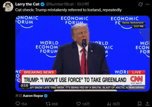 一名美国记者在X平台写道:"特朗普总统在讲话中,似乎把格陵兰岛和冰岛搞混了。"