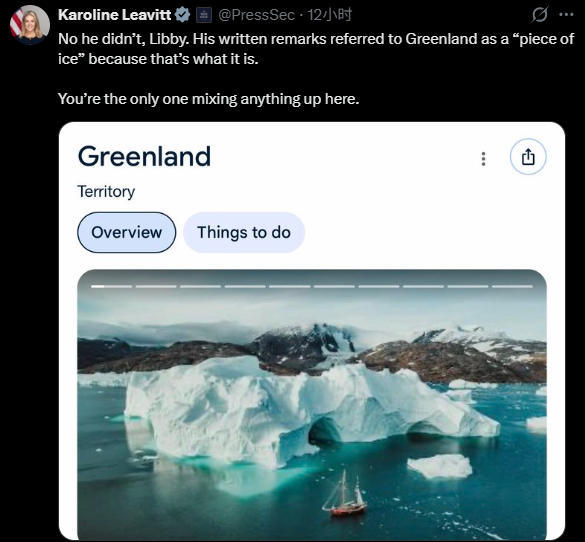 此番言论遭到白宫激烈否认。白宫发言人卡罗琳·莱维特第一时间转发该推文,强行找理由为特朗普"洗地"。她表示:"不,他没有。他的书面讲稿将格陵兰岛称为'一块冰'(a piece of ice),因为它本来就是一块冰。只有你一个人把事情搞混了。"