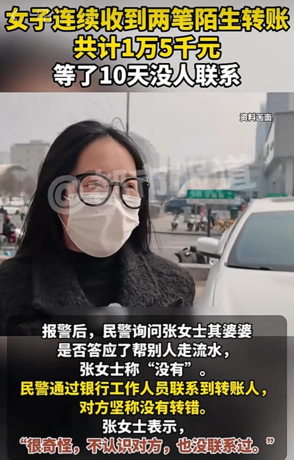 郑州张女士婆婆3月1日晚上收到两笔转账,合计15000元,对方是陌生人,等了10天没人联系,问遍亲戚朋友甚至欠债的都没线索,吓得赶紧报警。