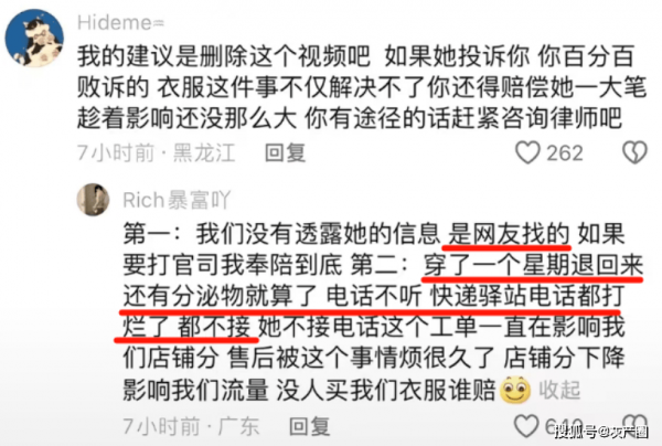 她承认裙子是自己退的,可她不回复店主的消息,是因为当时在刮台风,如今老板这样曝光自己,恶意传谣泄露隐私侵犯了她的个人权益,已报J处理。