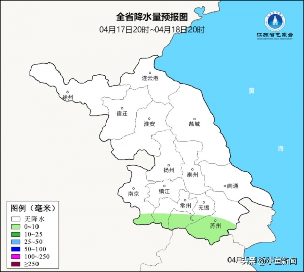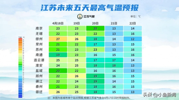 最高温度:沿江和苏南地区21~22℃,江淮之间东部地区16℃左右,其他地区18~19℃;