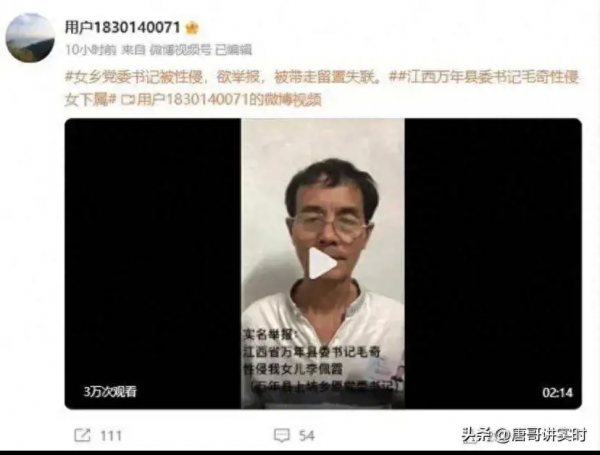 实名举报人李长柳通过网络举报,女儿李佩霞是万年县上坊乡原党委书记。长期受到县委书记毛奇的精神控制,强制猥亵、性侵。今年5月23日,李佩霞表示要去省里举报毛某,但三天后被万年县纪委监察委员会带走并留置至今,无法对外发声。25日深夜,上饶市发布通知称,市委在关注县委领导毛某网上举报万年后,高度重视。最后劝诫大家,莫信谣,别传谣!