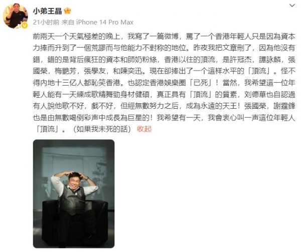 王晶:一个香港年轻人只因为资本力捧而升到了一个荒谬而与他能力不对称的地位。昨天我把文章给删除了,因为他没有错,错的是背后疯狂的资本和师奶粉。
