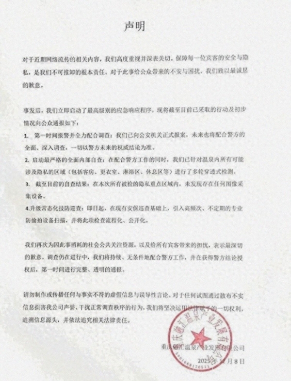 12月8日,重庆融汇温泉产业发展有限公司发布声明,启动最高级别应急响应,报警、配合调查,做多轮"穿透式"检测,声称隐私重点区域未发现任何图像采集设备,并承诺升级常态化技防巡查