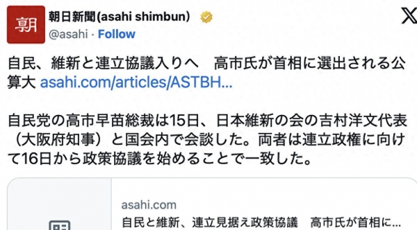 其次,维新会和其他两个在野党谈得很不顺,根据日媒的说法,在10月15日的会谈中,三大在野党在宪法修正、集体自卫权与能源政策等重大议题上仍存在"显著分歧",而在10月15日,高市早苗突然和维新会进行了一次会谈,维新会现任党代表、大阪知事吉村洋文在会谈后表示,两党的基本政策"几乎一致",对于"副首都构想"和"社会保障改革"这两大政策,他们已经有初步共识想法,接下来将进行细致协商,才能确定两党是否真的将携手合作联合执政。