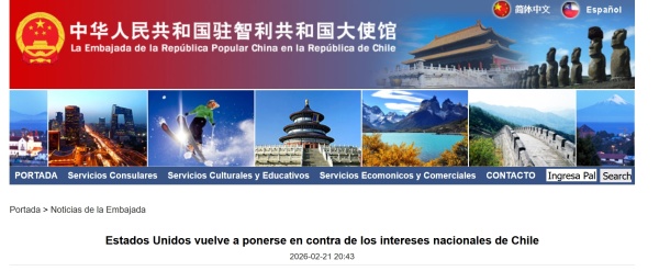 中国驻智利大使馆21日发表西班牙语声明,指责美国对"智利的主权、尊严和国家利益表现出明显蔑视"。