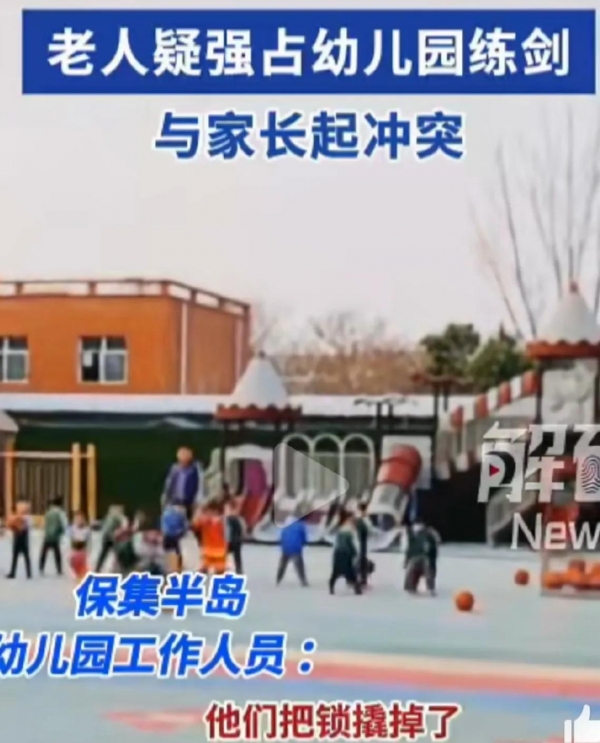 "一群持剑的老人在幼儿园操场晨练,孩子们入园得绕着走,这也太危险了!"11月3日,江苏扬州保集半岛幼儿园的家长们送孩子上学时,全都揪紧了心,一场关于场地使用权的冲突就此爆发。