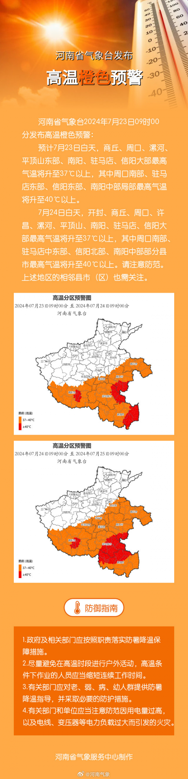 据最新气象资料分析,预计7月23日白天,商丘、周口、漯河、平顶山东部、南阳、驻马店、信阳大部最高气温将升至37℃以上,其中周口南部、驻马店东部、信阳东部、南阳中部局部最高气温将升至40℃以上;7月24日白天,开封、商丘、周口、许昌、漯河、平顶山、南阳、驻马店、信阳大部最高气温将升至37℃以上,其中周口南部、驻马店中东部、信阳北部、南阳中部部分县市最高气温将升至40℃以上。