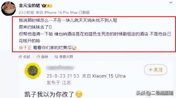 随着许凯的塌房,他的老板于正也没好到哪里去,直接曝出了大瓜,放出他和白月光的合照,