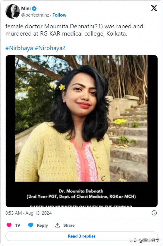 受害者是一名31岁的实习医生Moumita Debnath,当时正在公立医院RG Kar中值夜班。凌晨3点至6点间,惨遭侵犯。