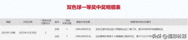 一等奖开出2注单注奖金高达1000万元,其中吉林辽源市龙山区喜中1000万元、山东聊城市莘县喜中1000.0020万元;