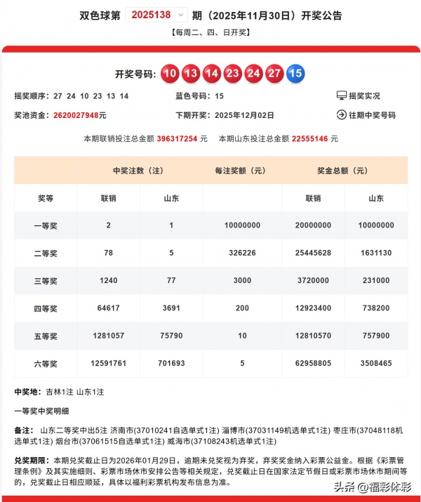 北京时间2025年11月30日,11月的最后一天,双色球第2025138期开奖!