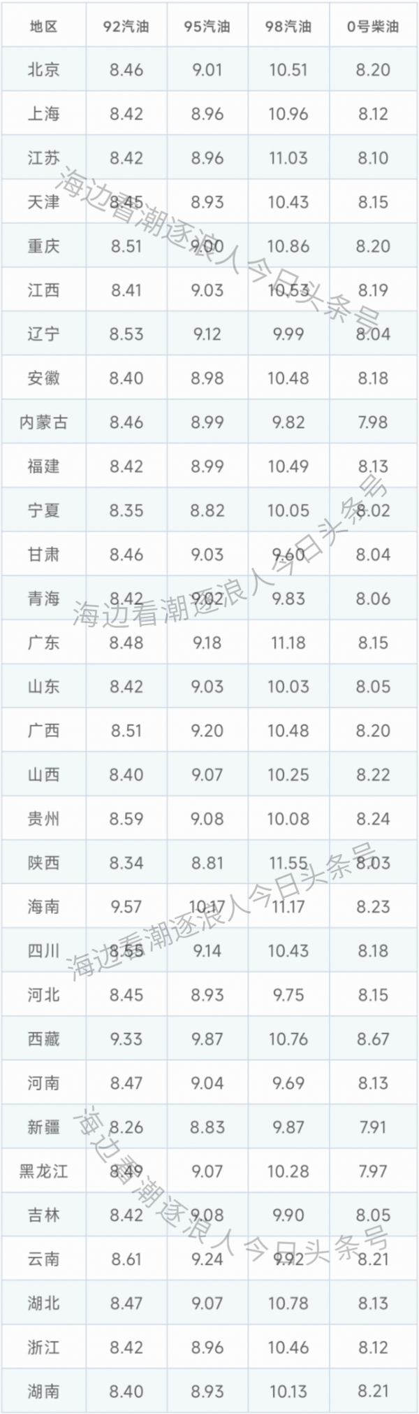 对于陕西、青海、四川、西藏、内蒙古、贵州、黑龙江、云南、新疆等省份的油价没有实行统一价格,这边列出的是省会城市的最高零售价格。
