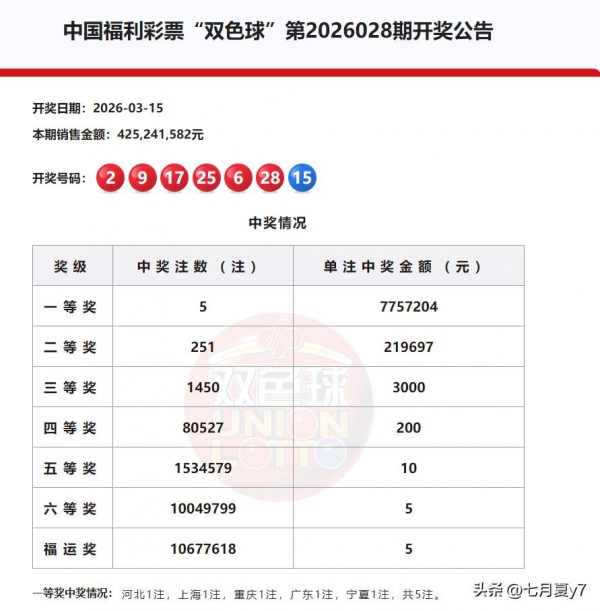本期双色球红球开出了02、06、09、17、25、28,蓝球15。红球前区(01-10)直接"开派对",02、06、09三个号码手拉手出现,中区(11-20)只来了个"独行侠"17,后区(21-30)则有25、28压阵。