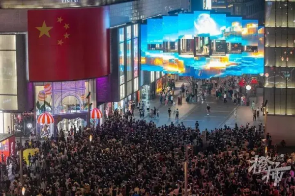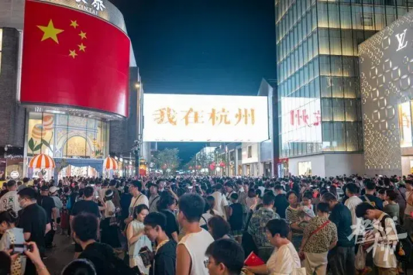 据橙柿互动报道,9月30日晚上7点多,杭州湖滨步行街上,国庆假期的第一批游客已经抵达这里了。