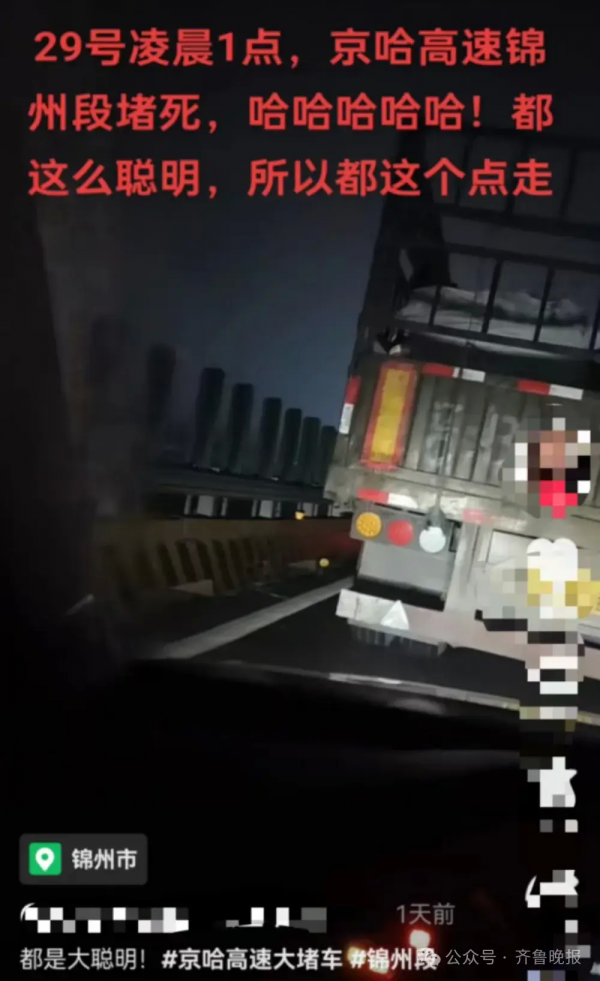 9月29日凌晨,一位自驾去河南的网友晒出京哈高速锦州段堵车视频,称没想到大家"都这么聪明,都这个点走"。
