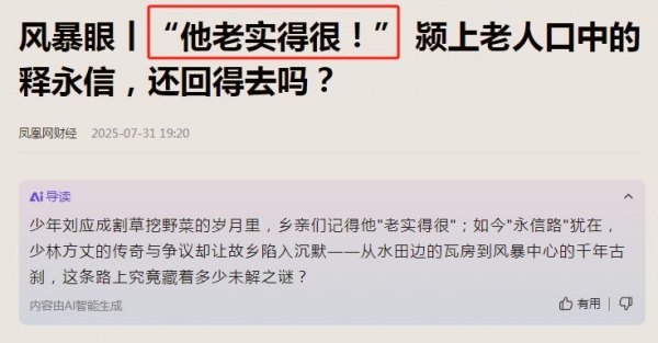 释永信被调查闹得沸沸扬扬,他老家也被凤凰网记者"抄家"式采访,但是结果令人大失所望,村中老者坚称释永信"老实的很",释永信在乡亲们的眼中似乎是个很单纯的形象。