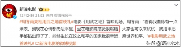 除了脸部状态引发热议之外,周冬雨在首映礼上的发言也受到了关注。在形容自己的观影感受的时候,周冬雨强调了心跳加速,还抽象地说"坐在电影院感觉很燃脂";在评价演员的表演的时候,周冬雨盛赞片中女主角齐溪的演技,但词语匮乏,只能不断地重复"太厉害了"。总之,周冬雨的发言就是很直白,很大白话,也难怪被网友吐槽谈吐不行了。