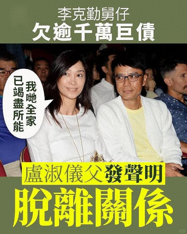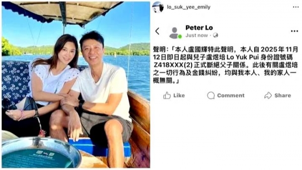 李克勤岳父在声明中明确表示,自2025年11月12日即日起与儿子卢煜培正式断绝父子关系,卢煜培此后的一切行为及金钱纠纷,均与他和家人一概无关。如此决绝的姿态,在讲究"家丑不可外扬"的传统观念里实属罕见。
