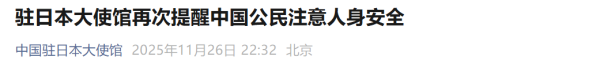 26日晚,中国驻日本大使馆发布消息,再次提醒中国公民注意人身安全。