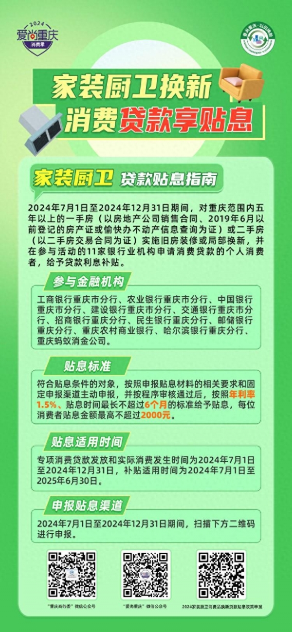 7月15日,上游新闻记者从重庆市商务委获悉,为充分释放家装厨卫消费品以旧换新市场潜力,2024年7月初,市商务委联合重庆金融监管局印发了《关于组织实施2024家装厨卫消费品以旧换新消费贷款贴息政策的通知》(渝商务〔2024〕174号),决定从2024年7月1日起实施家装厨卫消费品以旧换新消费贷款贴息政策,组织中国银行等11家银行业金融机构及全市家电、家居、家装、厨卫等行业重点企业,加强政企联动推进实施"金融+家装"惠民消费政策,采取有力措施着力提振家装厨卫消费品以旧换新市场信心,为全市经济持续稳定增长提供有力支撑。