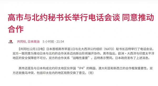 在中日关系紧张之际,北约给高市早苗打来电话谈论安全问题,暗示"印太有事就是大西洋有事"的话题,目的是要为高市早苗政府撑腰。
