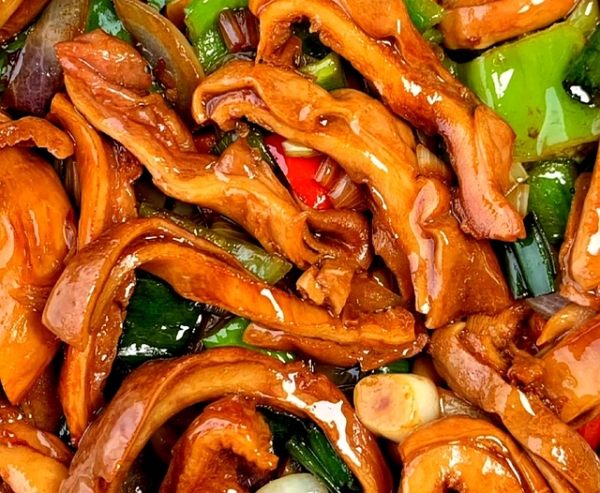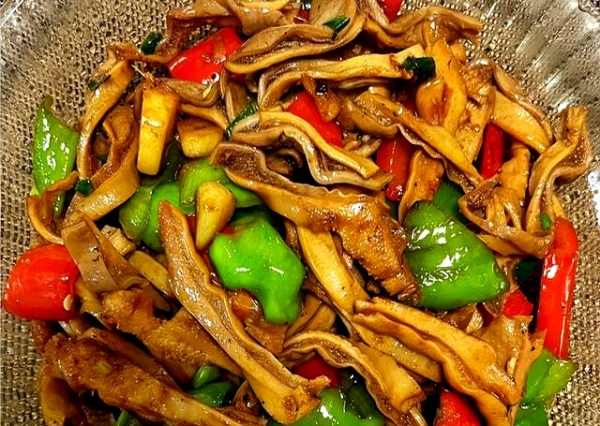 青红椒切粗条,和猪肚一起下锅,火要大,锅要热,生抽老抽一淋,颜色立马精神。