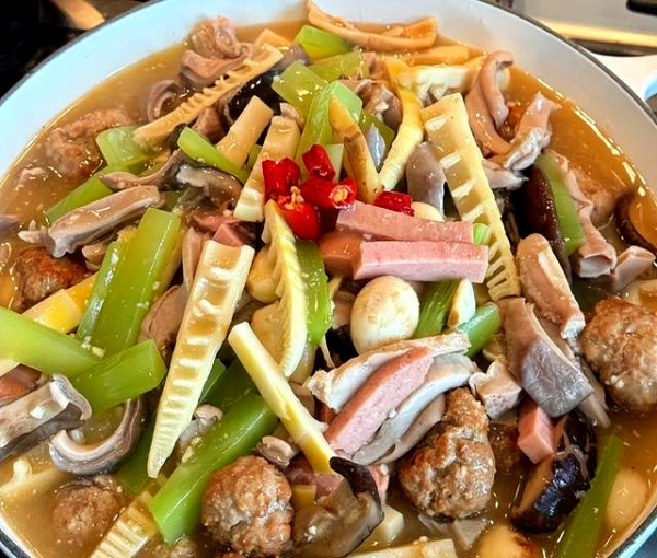 干香菇、干鱿鱼、猪肉馅全扔进砂锅,猪肚先炖一小时,再和其他料汇合,最后勾个薄芡。