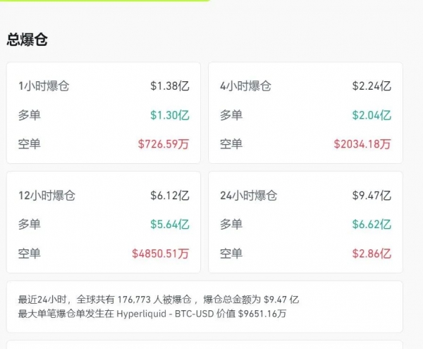 据Coinglass数据显示,24小时内,全网共有176721人被爆仓,爆仓总金额为9.47亿美元(约合人民币67亿元)。