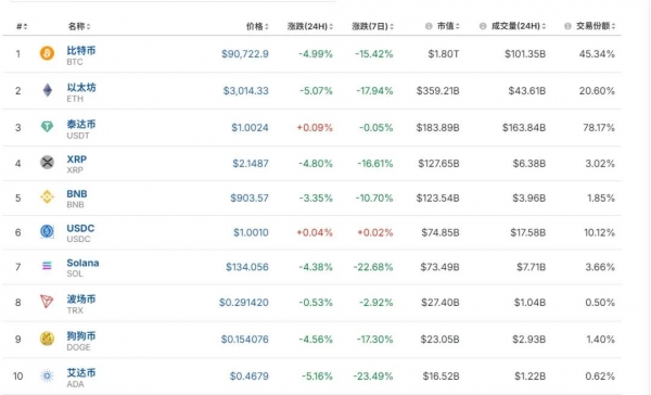 截至发稿,比特币报90722.9美元,跌幅4.99%。以太坊、艾达币跌超5%,狗狗币跌4.56%。