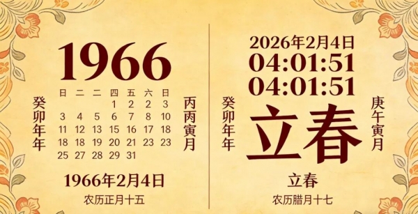 2026 年立春的准确时间是2 月 4 日凌晨 4 时 01 分 51 秒,农历腊月十七,这个时间点的立春,往前数整整 60 年,还是 1966 年才有过。这样的早立春现象,是公历、农历和干支纪年相互契合形成的天文历法结果,一个甲子轮回才遇一次,错过这次就要再等 60 年,也正因如此,2026 年的立春才被称作百年难遇的特殊节点,值得咱们格外重视。
