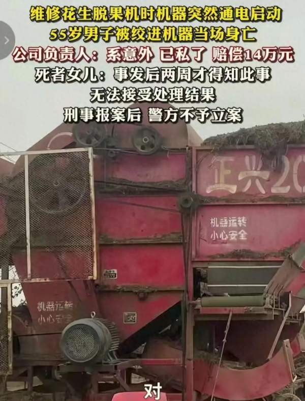 反过头来看涉事方说辞,堪称蹩脚辩解--原来他们意图为场地照明通电,没想到花生脱果机的电路和大灯线路共用一个总闸,而机器的电闸竟然没关,"一不小心"便启动了机器。遇上这管线混乱,谁都看得出管理漏洞之大。
