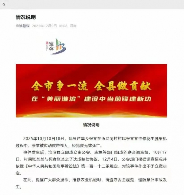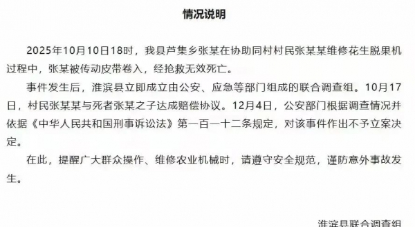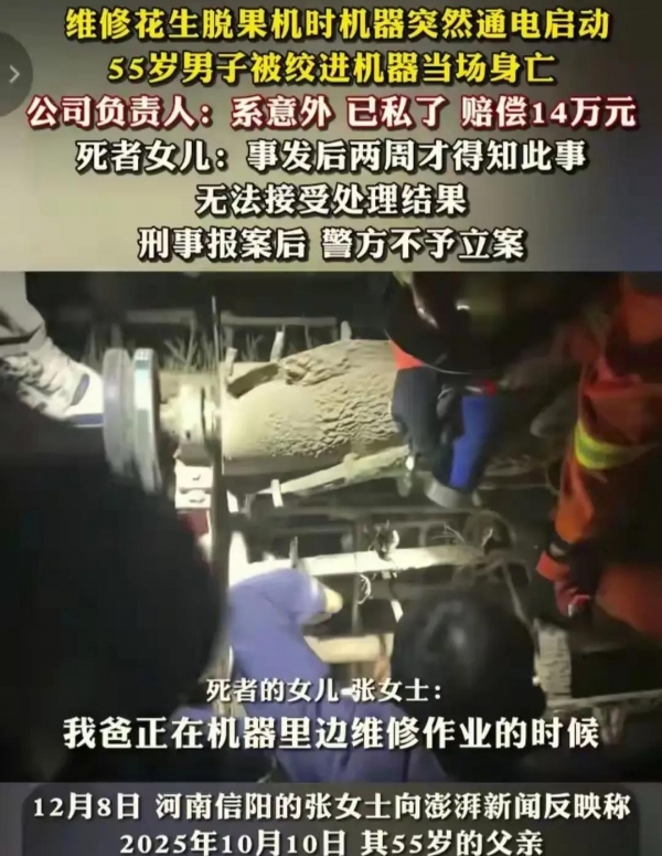 12月9号,联合调查组曝光的通报确认了事件经过,死者确实是在修理中被传动皮带裹住丧命。但紧接着,公安部门一声"不予立案",将案件草草打住,原因是认为属意外事故。