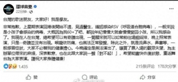 张学友也通过环球音乐官方社交账号表示,自己感染了RSV(呼吸道合胞病毒),无法正常发声,确定无法演出。