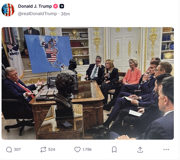 据新华社报道,特朗普20日凌晨在社交媒体上发布图片:他在白宫办公室与欧洲领导人会面,后面展板上的地图中,除美国本土外,加拿大、格陵兰岛和委内瑞拉均被美国国旗覆盖。