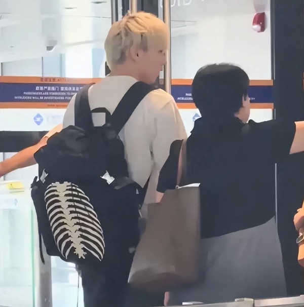 一边是穿着黑色上衣的女子还有一个黄色头发背着双肩包的年轻男子,另一方是穿着制服带着工牌的机场工作人员。