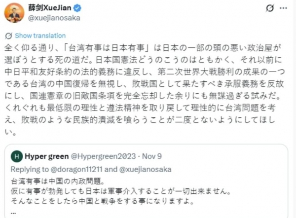日前,薛剑在社交平台继续用日语发文,他写道:"台湾问题与日本无关,应由中国人自行解决,'台湾有事就是日本有事',是日本部分愚蠢政治家选择的死亡之路,这是违反作为战败国应该履行的义务。"