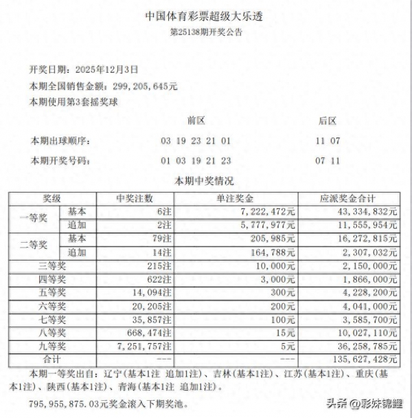 今天12月3日,星期三,晚上大乐透25138期开奖出炉了!以下 是本期的开奖公告: