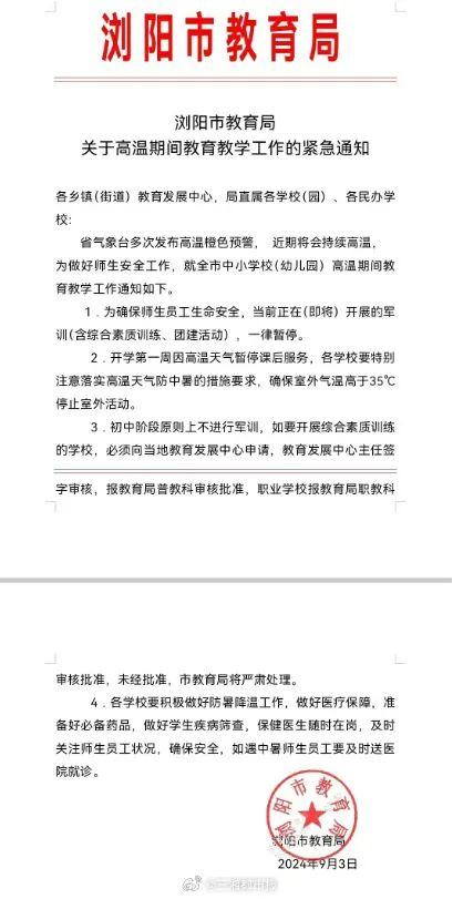 9月3日,记者了解到,因持续高温,长沙市浏阳教育局就全市中小学校(幼儿园)高温期间教育教学工作做出调整。