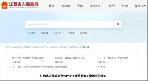 11月24日,江西省政府办公厅印发《关于调整我省最低工资标准的通知》(赣府厅发〔2025〕42号),明确从2025年12月1日起,对全省最低工资标准进行调整。