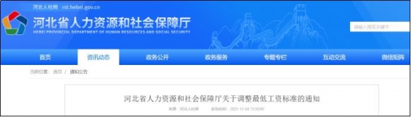 12月4日,河北省人社厅发布《关于调整最低工资标准的通知》,本次调整的最低工资标准自2025年12月1日起执行。