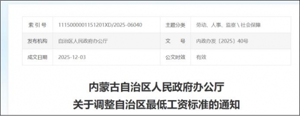 12月3日,内蒙古自治区人民政府办公厅发布《关于调整自治区最低工资标准的通知》,调整后的全日制月最低工资标准和非全日制工作小时最低工资标准自2025年12月1日起执行。