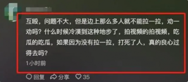 而且再细想一下,大家也要学会换位思考,如果自己是那一名红衣女子,被打得站不起身了,谁不希望有一个英雄帮忙或者打电话报警,可以拯救自己了?